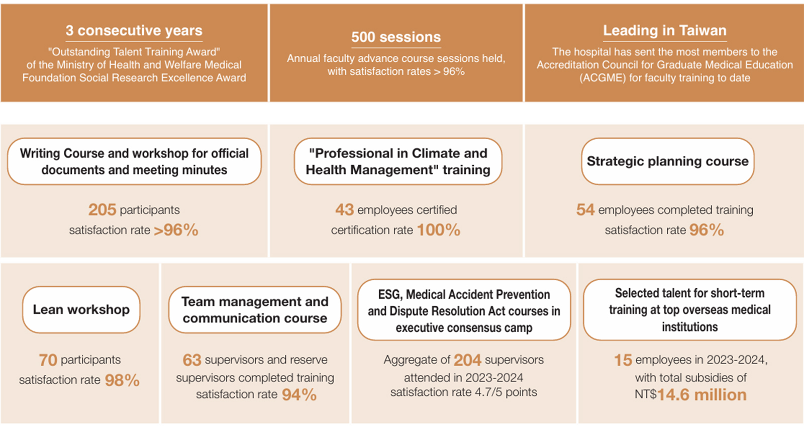 Cathay General Hospital has established a hospital-appointed faculty system, holding "Faculty Advance Courses" annually, collaborating with the Accreditation Council for Graduate Medical Education (ACGME) in the United States, achieve recognition as one of 6 overseas faculty development promotion centers. To date, 22 faculty members have been sent to ACGME for faculty training.