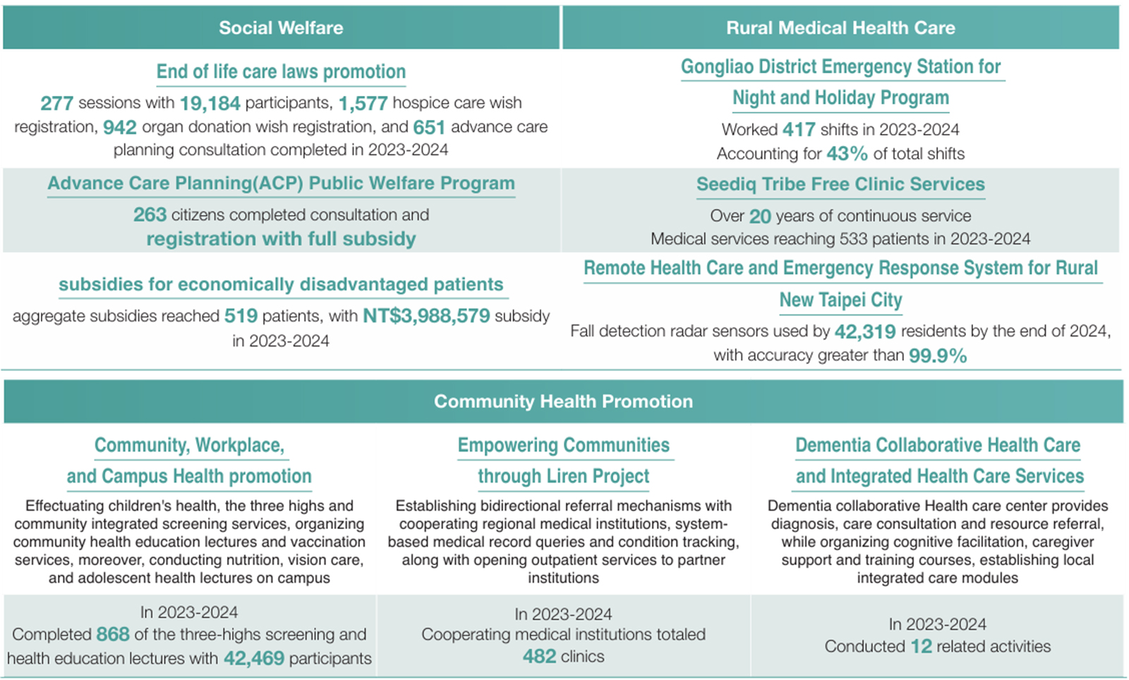 Cathay General Hospital upholds the purpose of "To give back to society through medical services", actively effectuate community health promotion and health education, dedicated to advancing public health literacy, and actively implementing national policies, expanding social welfare and rural medical services, fostering comprehensive health and well-being, and strengthening the resilience of the national health system.